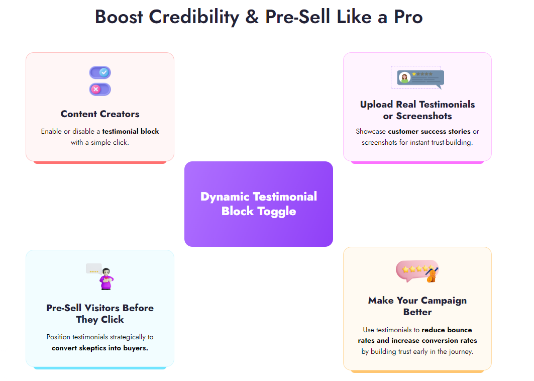 Testimonial Display: Showcase testimonials dynamically throughout the customer journey to build trust and encourage purchases.
