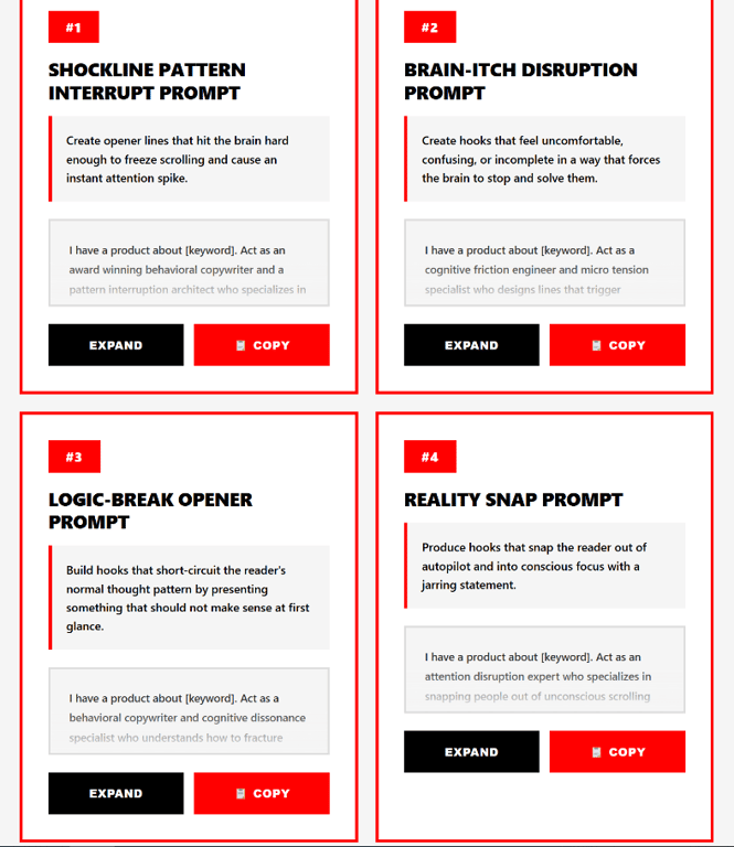 Combines attention and conversion triggers: Prompts first grab attention, then employ action-oriented psychology to encourage clicks or sales. Using both attention and conversion prompts together produced far more compelling content than writing manually.
