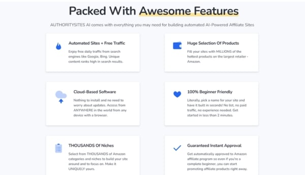 Automatically build affiliate marketing websites with hot Amazon products: AuthoritySites AI automatically creates comprehensive affiliate marketing websites for you featuring popular, trending, and high-demand Amazon products. As soon as you select your preferred category, this amazing system will automatically populate your website with automatically generated product listings, product reviews, and even supporting blog content for those products. This means you no longer need to research products, write product reviews, or add affiliate links. Even better, you'll get instant approval to join the Amazon affiliate program; this is one of the biggest hurdles most beginners face.