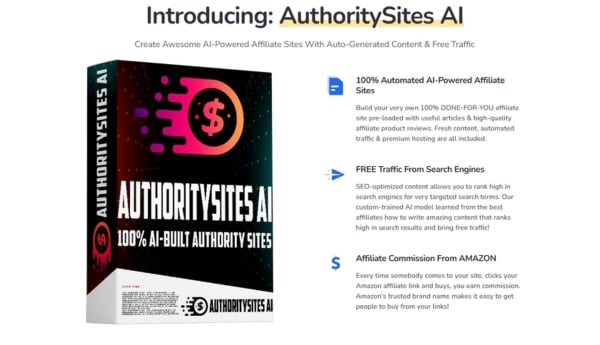 You’ll be able to create fully functional affiliate sites with AI-written product reviews, SEO-friendly blog articles, built-in Amazon affiliate links, and free organic traffic from search engines.