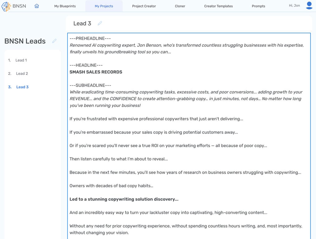 Blueprint system for persuasive copy: Instead of starting from scratch, BNSN develops a “Blueprint” for your project, outlining your ideal customer’s pain points, desires, and how your offer solves them. This framework guides the AI to produce copy optimized for high conversion rates.