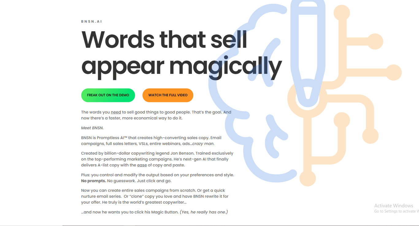 Specialized in sales and marketing copy: BNSN AI produces content for advertisements, email campaigns, video sales letters, webinars, and long-form sales pages.