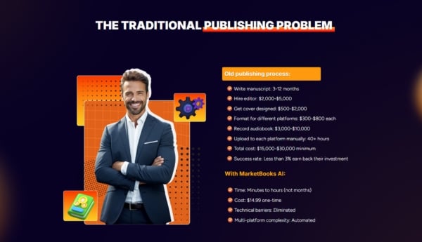 Eliminates the biggest barrier: writing and technical complexity: Most people's publishing projects fail before they even begin. Writing a book seems overwhelming. MarketBooks AI eliminates that entirely. You don't need to outline chapters, grapple with words, or try to format. AI handles content creation, structuring, converting to audiobooks, and creating a publishing manuscript from start to finish, making it truly feasible for anyone, even complete beginners.