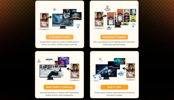 Includes AI-powered book creation using Google Gemini for fiction, non-fiction, children’s books, and more.