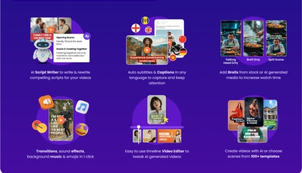 Using the Video and Voiceover sections, you can create marketing videos without appearing in them. This is done by the AI creating scripts based on the videos they select, along with natural-sounding voiceovers.