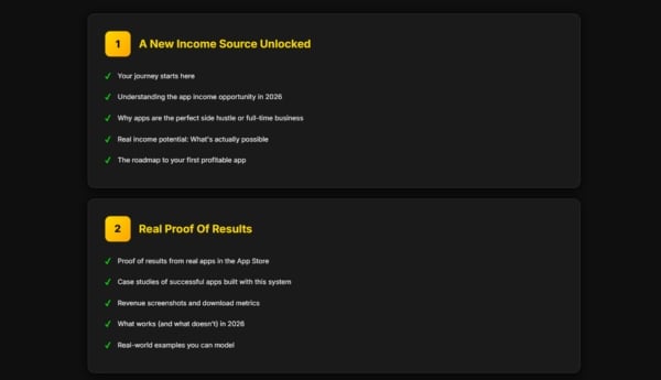 Designed for absolute beginners right from the start: In the initial modules, time is dedicated to explaining how the application ecosystem actually works, and this is fully documented. Laying the groundwork helps avoid common beginner mistakes and prevents project delays due to rejection or wasted time. Because things aren't rushed, the later stages of building, submitting, and monetizing are much less daunting.