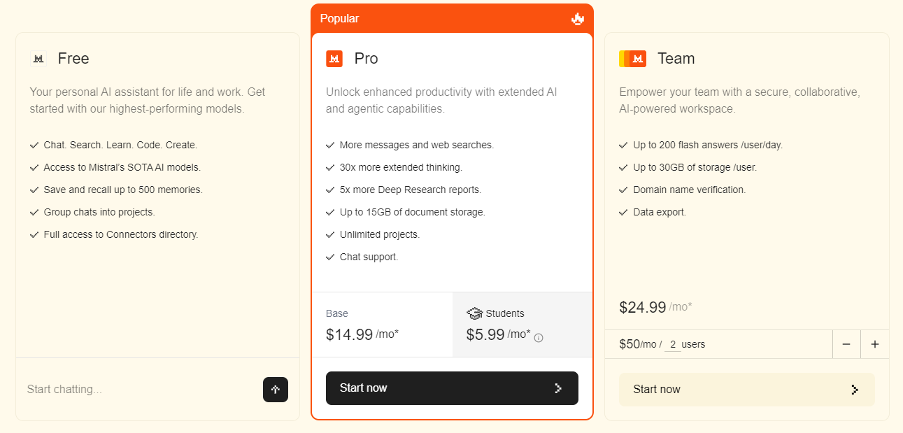 Enterprise Plan: Pricing is customized and requires direct consultation with Mistral AI’s sales team. It includes private models and advanced tools, making it primarily suitable for large organizations.