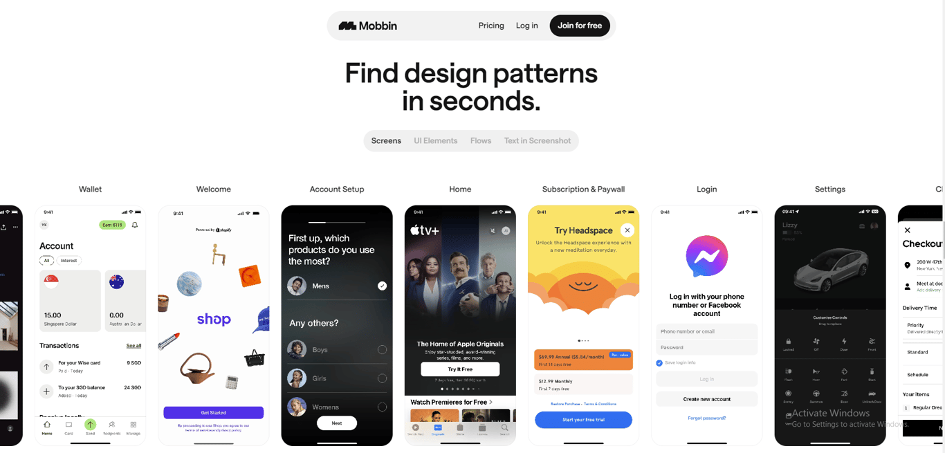 At its core, Mobbin is a comprehensive, well-structured library of UI screenshots sourced from thousands of leading mobile apps (iOS and Android) as well as web platforms. Instead of presenting random visuals, Mobbin organizes each app into clear user flows and common design patterns, making it easy to study, compare, and learn from real-world interfaces.