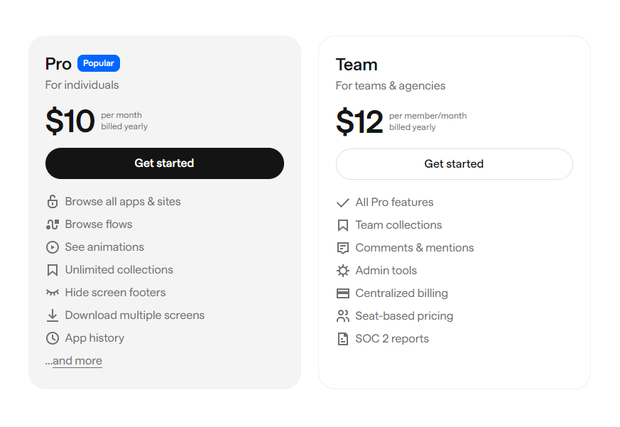 The Pro plan is ideal for solo designers, freelancers, and independent product builders who want full access to Mobbin’s inspiration library without the need for team collaboration features.