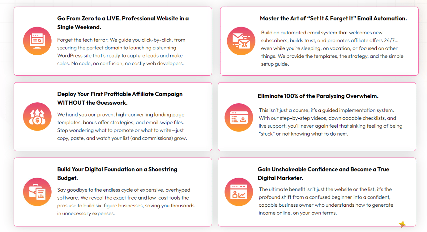 Through easy-to-follow video lessons, practical checklists, and ongoing support, the program keeps everything simple and beginner-focused while using free or affordable tools. Overall, it helps newcomers start earning online while developing real marketing skills and long-term confidence.