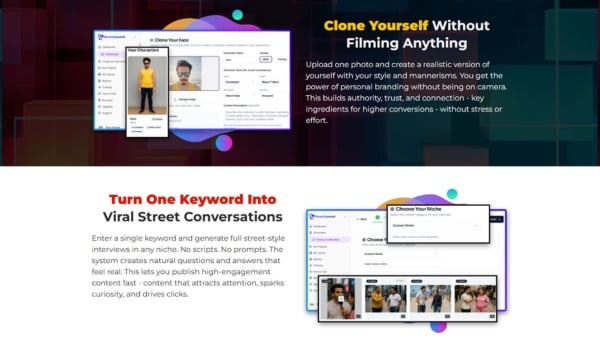 Clone Yourself Without Filming: With just one photo, you can create an authentic digital image of yourself, capturing your style, personality, and presence. This gives you the opportunity to build a strong and reputable online brand even if you never need to appear in front of a camera. You maintain your authenticity while eliminating stress, reshoots, and filming time.