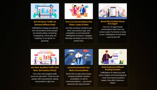 TrafficSiphon AI is not just a new tool or platform for social media or simply for attracting traffic, but a smart way to reach audiences who are searching for solutions, comparing products, or discussing things related to your products or services. With AI, comments can now generate clicks, leads, and opportunities organically, saving you hours of effort.