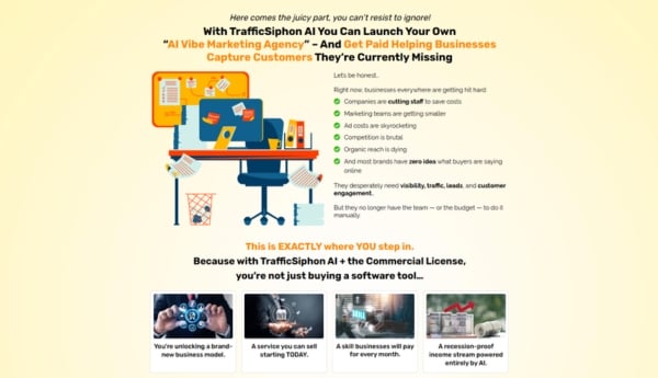 Developing opportunities for service providers, affiliate partners, and agencies: With the included commercial license, users can sell TrafficSiphon AI as a service. You can manage campaigns for clients, provide comprehensive traffic solutions, or launch your own AI-based interactive service – keeping 100% of the revenue.