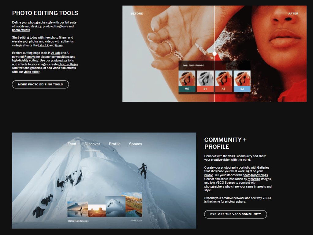 VSCO Learn: VSCO Learn provides tutorials and guides to improve your photography and editing skills. Acting like a personal coach, it offers tips and step-by-step instructions to help you master the app and boost your creative output.