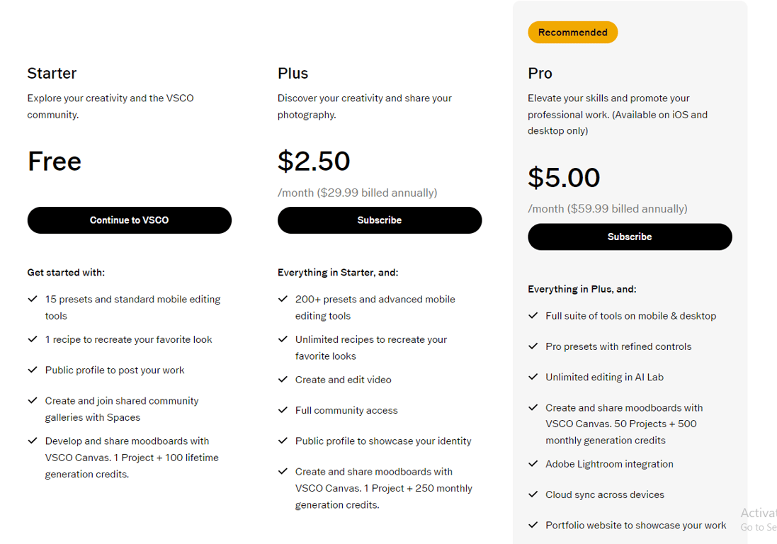 | Pro | $5.00/month (billed $59.99 annually) | Creators who want the full toolset on mobile and desktop, the ability to make and share moodboards with VSCO Canvas, plus 50 projects and 500 monthly generation credits. |