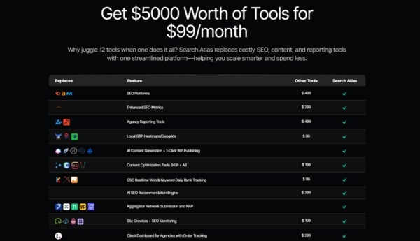Search Atlas includes most essential features like keyword research, site audits, content tools, competitor backlink checks, and reporting at a more affordable price. It focuses more on workflow automation/efficiency than Ahrefs and Semrush, which have larger historical data repositories.