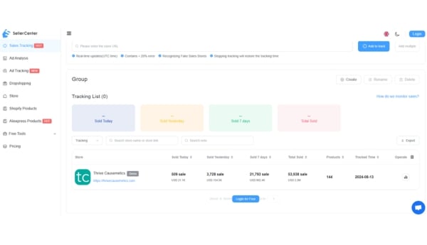 Track Shopify store sales: SellerCenter lets you track your competitors' Shopify stores and their actual sales. You can add multiple Shopify stores to your watchlist and group them with just one click. With real-time sales and revenue data available on the platform, you can clearly see which stores are performing well and which products are achieving results. SellerCenter's automated detailed reporting generates detailed monitoring reports every 14 days, which can be exported so you can review sales trends and make more accurate data-driven decisions.
