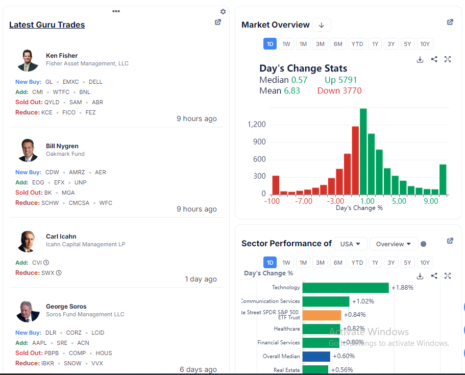Guru & Institutional Investor Tracking: Allows users to monitor the portfolios and trading activity of famous value investors, hedge funds, and institutions to understand what experienced investors are buying or selling.