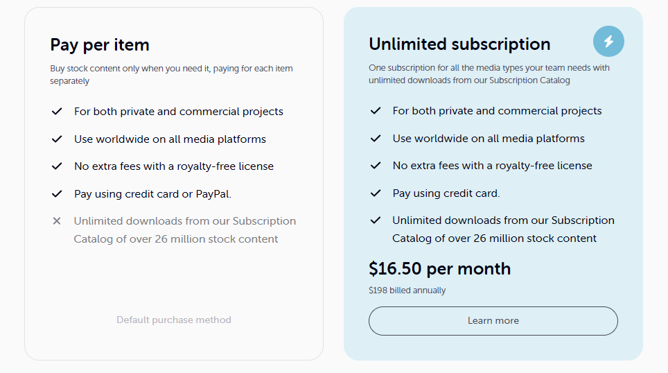 | Unlimited Subscription | $16.50 / month | $198 billed annually | Unlimited downloads from the subscription library |