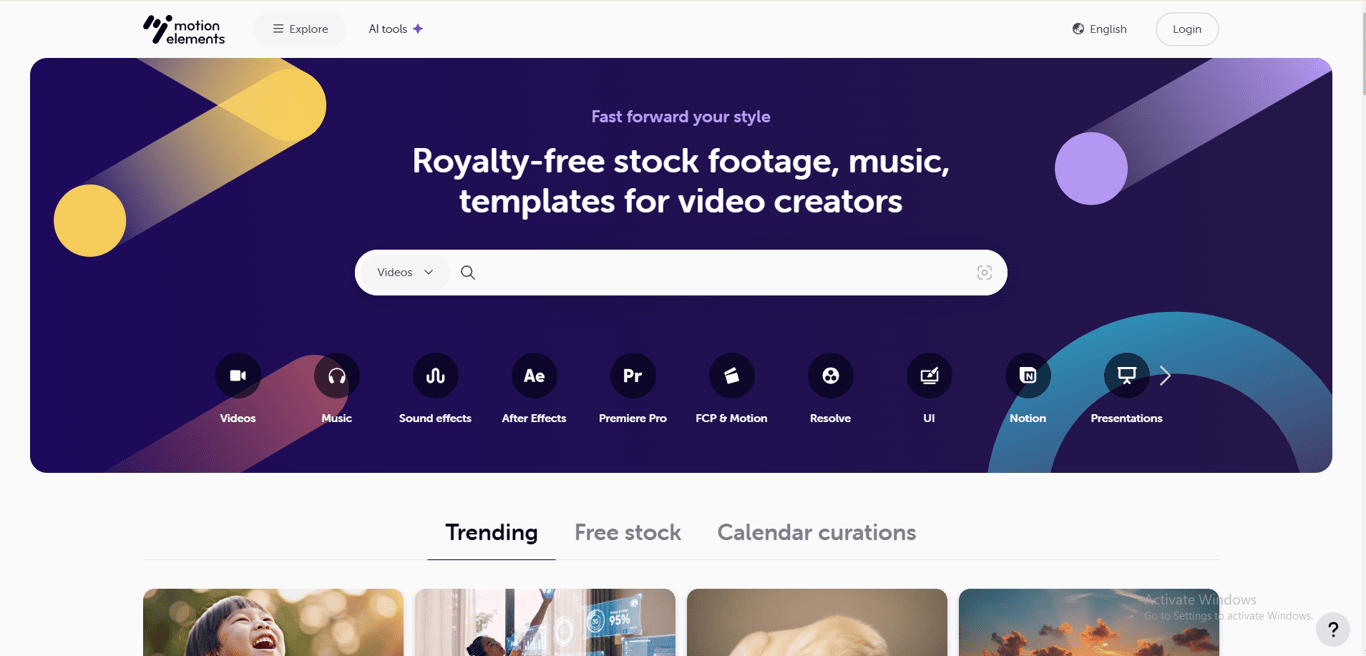 Large royalty-free asset library: MotionElements offers millions of creative assets, including stock videos, motion graphics, video templates, music tracks, sound effects, images, and 3D elements. This wide range makes it suitable for nearly any type of video or design project.
